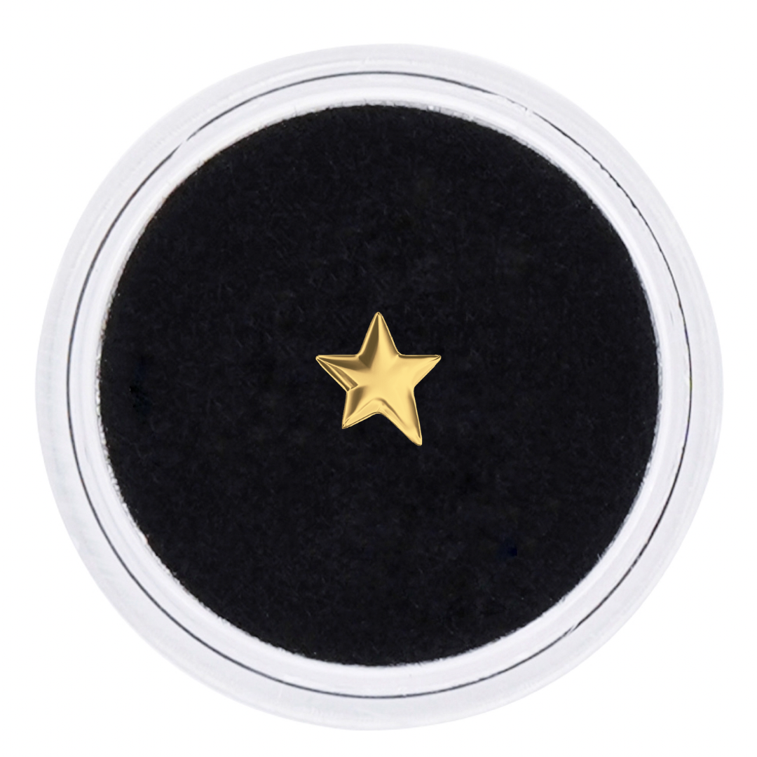 Dentluxe's 18k SOLID GOLD IRREGULAR STAR Gold Tooth Gems are manufactured from only the finest 18k Solid Yellow Gold. They will not tarnish or discolour in the mouth. All gems have a flat back surface making it possible to safely bond the gem to your tooth. The size of each gem is approximately 5mm (0.5mm thickness). The price listed is for 1 Gold Tooth Gem. Transparent Jar included.