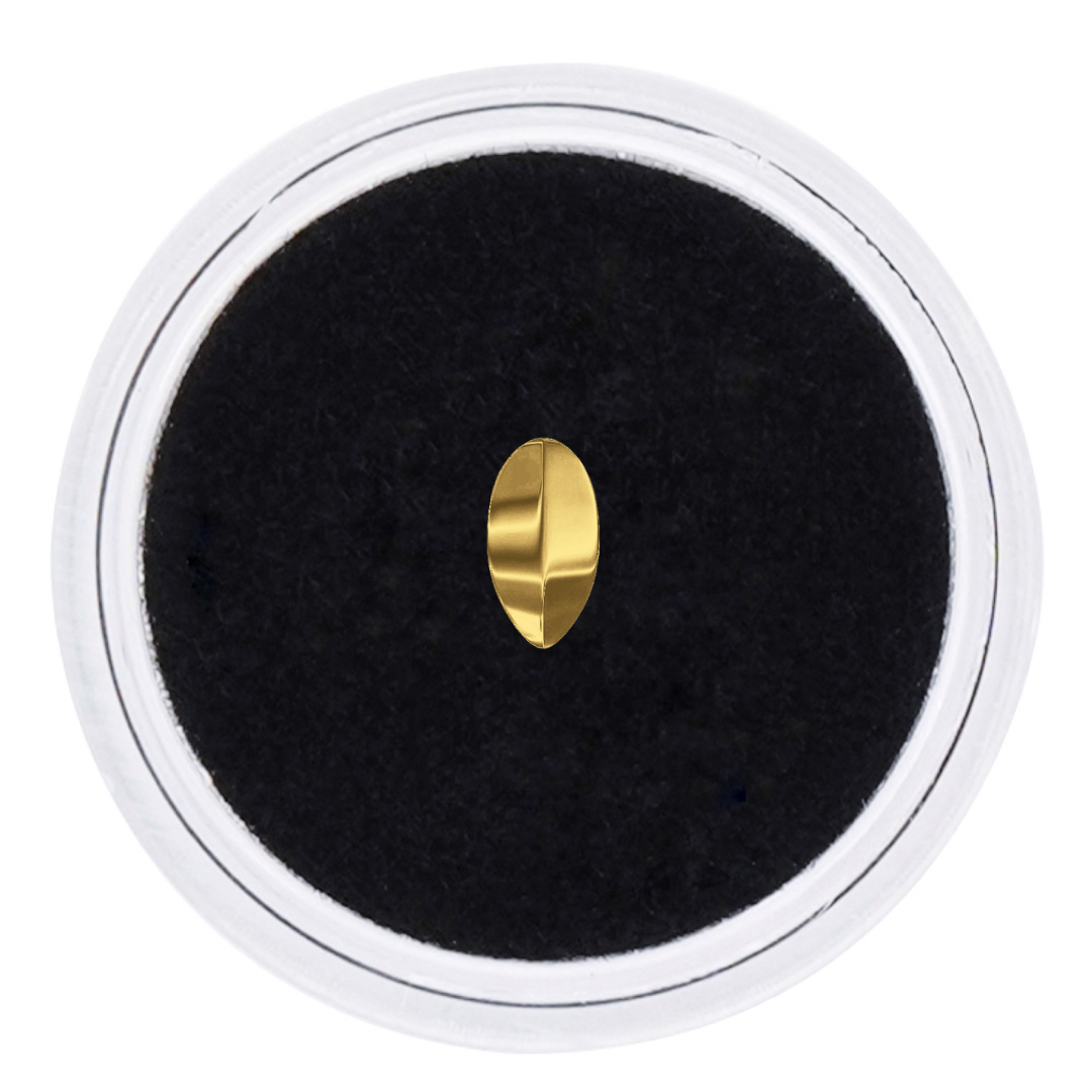 Dentluxe's 18k SOLID GOLD OVAL CAP Gold Tooth Gems are manufactured from only the finest 18k Solid Yellow Gold. They will not tarnish or discolour in the mouth. All gems have a flat back surface making it possible to safely bond the gem to your tooth. The size of each gem is approximately 5mm (0.7mm thickness). The price listed is for 1 Gold Tooth Gem.