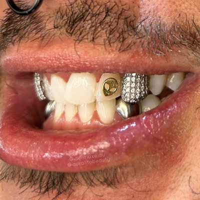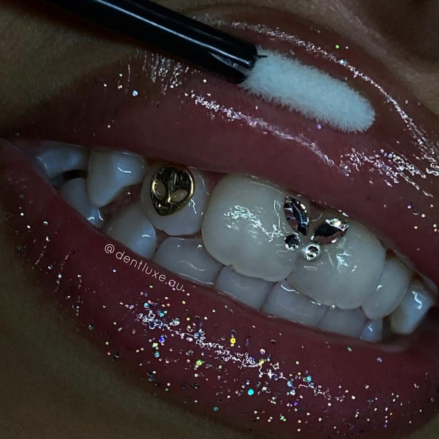 Dentluxe's 18k ALIEN Gold Tooth Gems are manufactured from only the finest 18kt Solid Yellow Gold. They will not tarnish or discolour in the mouth. All gems have a flat back surface making it possible to safely bond the gem to your tooth. The size of each gem is 4mm x 3mm (0.7mm thickness). The price listed is for 1 Gold Tooth Gem. Transparent Jar included.